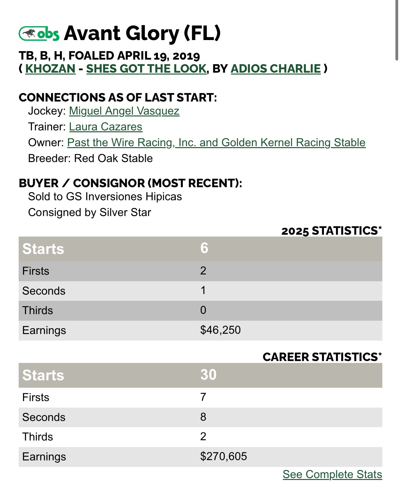 A durable and consistent racehorse, Avant Glory made 30 career starts, tallying 7 wins, 8 seconds, and 2 thirds with earnings of over $270,000. He proved his class at the racetrack, competing successfully at the stakes level and showcasing both speed and toughness—traits breeders seek in a modern stallion.