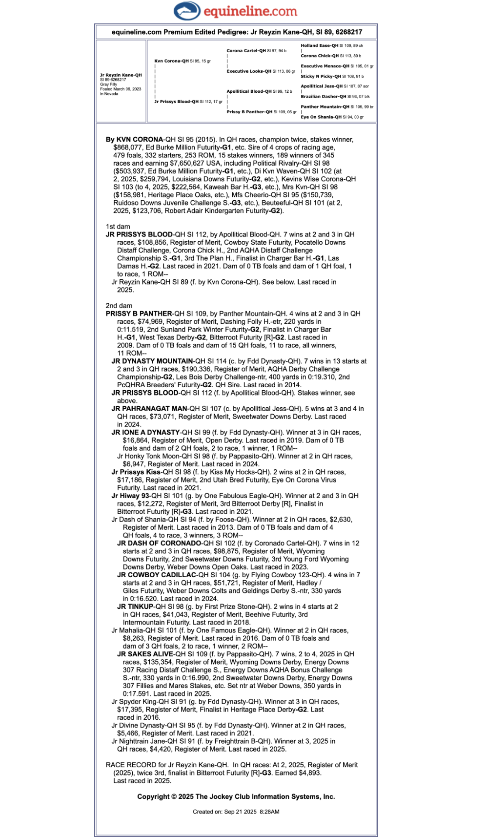 By Kvn Corona-QH SI 95 out of Jr Prissys Blood-QH SI 112, by Apollitical Blood-QH
