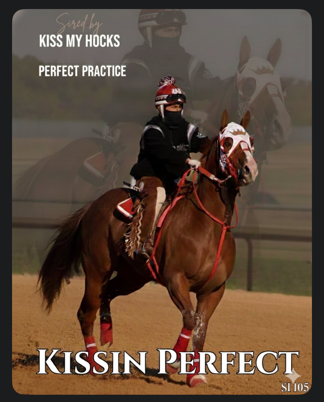 Perfect Practice, by the prominent sire One Famous Eagle, had a successful racing career with $62,885 in earnings and a Register of Merit. She demonstrated her racing prowess with multiple stakes placements, including a third in the **Zia Park Championship-G1** and the **La Fiesta Derby**. Kissin Perfect is her only foal to race, already showcasing stakes-placed success.