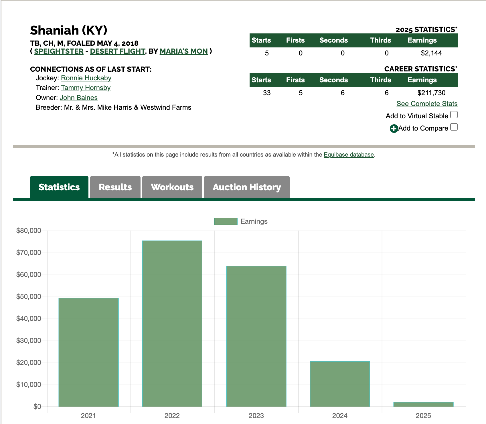 Who boasts an impressive racing record. This mare has had a successful career, winning races at prestigious venues such as (Churchill Downs) and (The Fairgrounds), among others, and has earned over **$200,000** on the track.