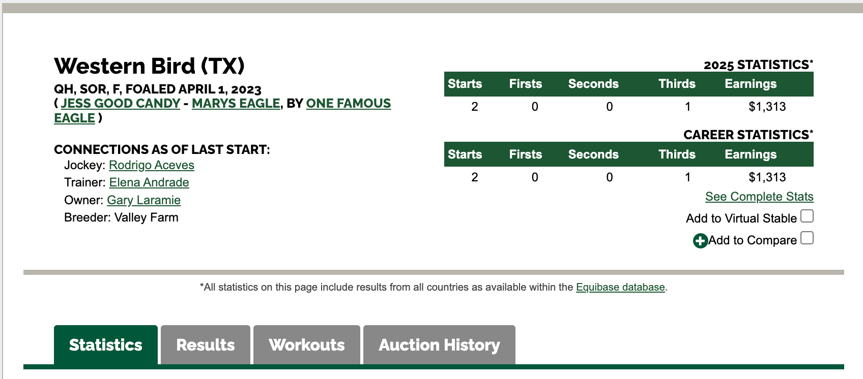 Raced under the ownership of Gary Laramie and trained by Elena Andrade, Western Bird has made two career starts to date, recording one third-place finish and earnings of $1,313. She is ridden by jockey Rodrigo Aceves.